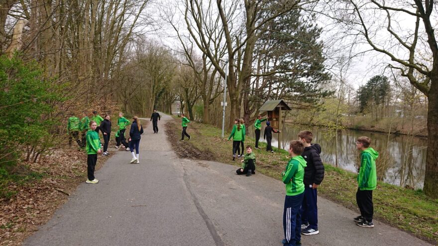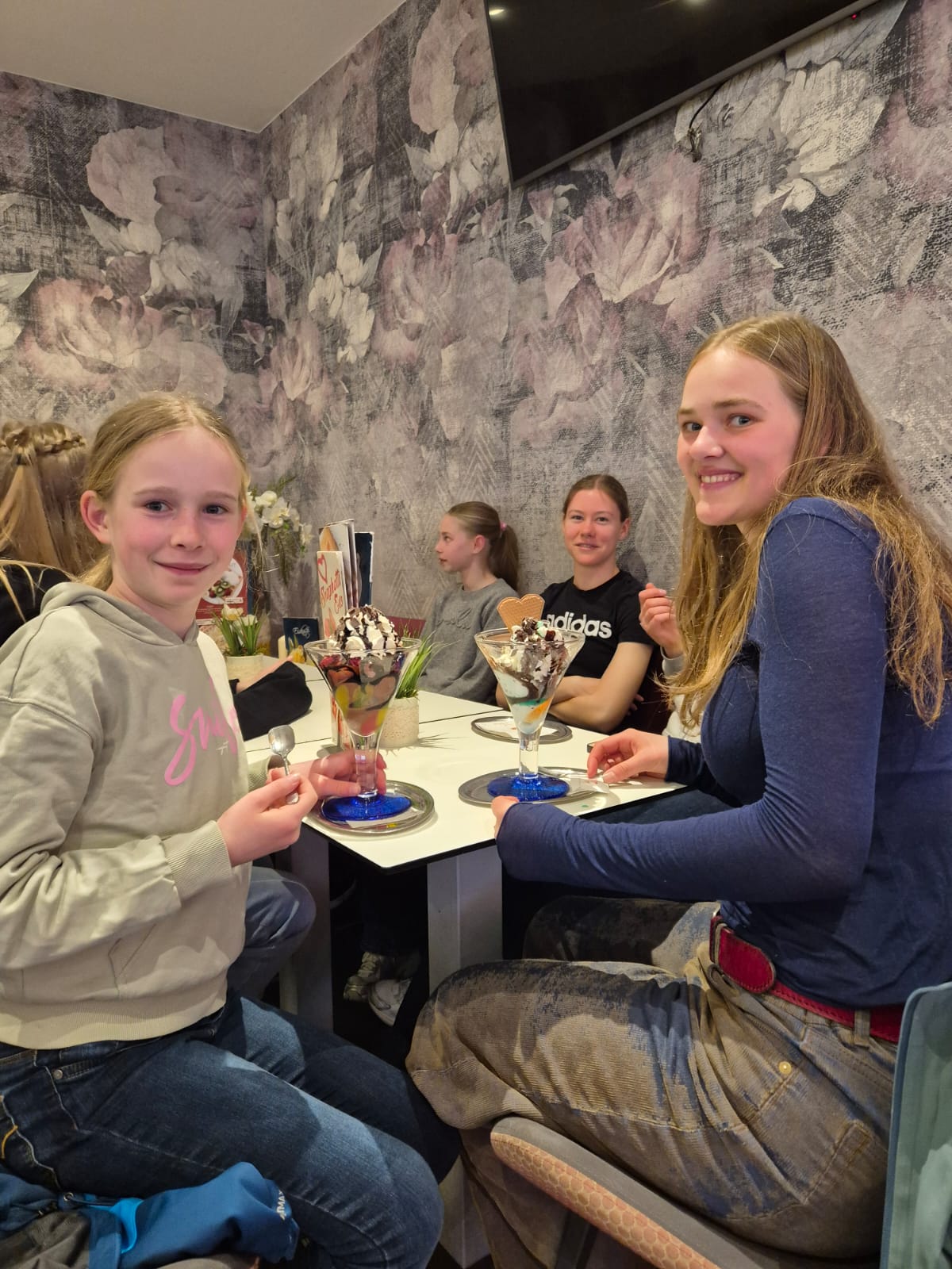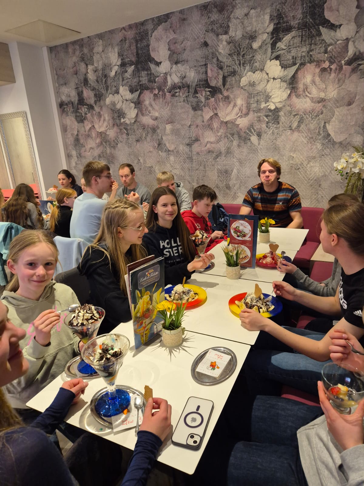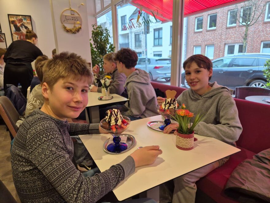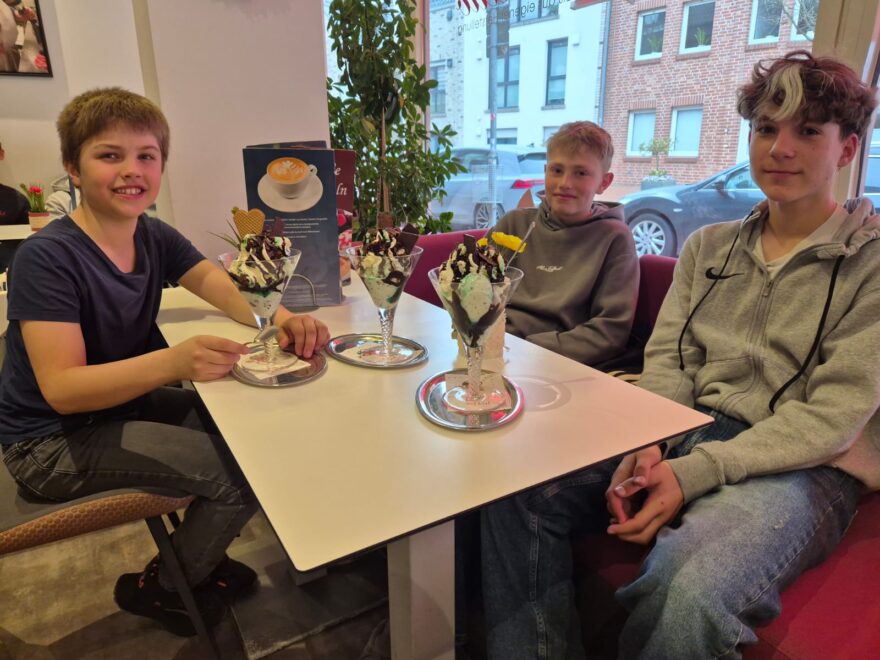 Danach gingen wir auf den Sportplatz,anschließend spielten wir Rugby zur Aufwärmung. Danach liefen wir drei Sprints sowie zwei weitere Sprints mit einem Schirm, was ziemlich anstrengend war. Die Großen machten währenddessen Hochsprung. Außerdem übten wir Werfen und machten zum Schluss Berg und Talläufe,was ein anstrengender Abschluss war. Um 12:30 Uhr gab es Mittagessen. Es gab Kartoffelsuppe mit Karotten und (veganer) Bockwurst. Nach dem Essen hatten wir zwei Stunden Pause, in der wir uns ausruhen konnten. Um 15:00 Uhr gingen wir los, um Eis essen zu gehen. Das war ein schöner Ausflug und hat uns allen gut gefallen. Danach durften wir uns frei in der Stadt bewegen,und Snacks und andere Dinge kaufen. Um 18:00 Uhr kehrten wir zur Jugendherberge zurück. Um 18:30 Uhr gab es Abendessen mit Pfannkuchen, was ein gelungener Abschluss des Tages war.