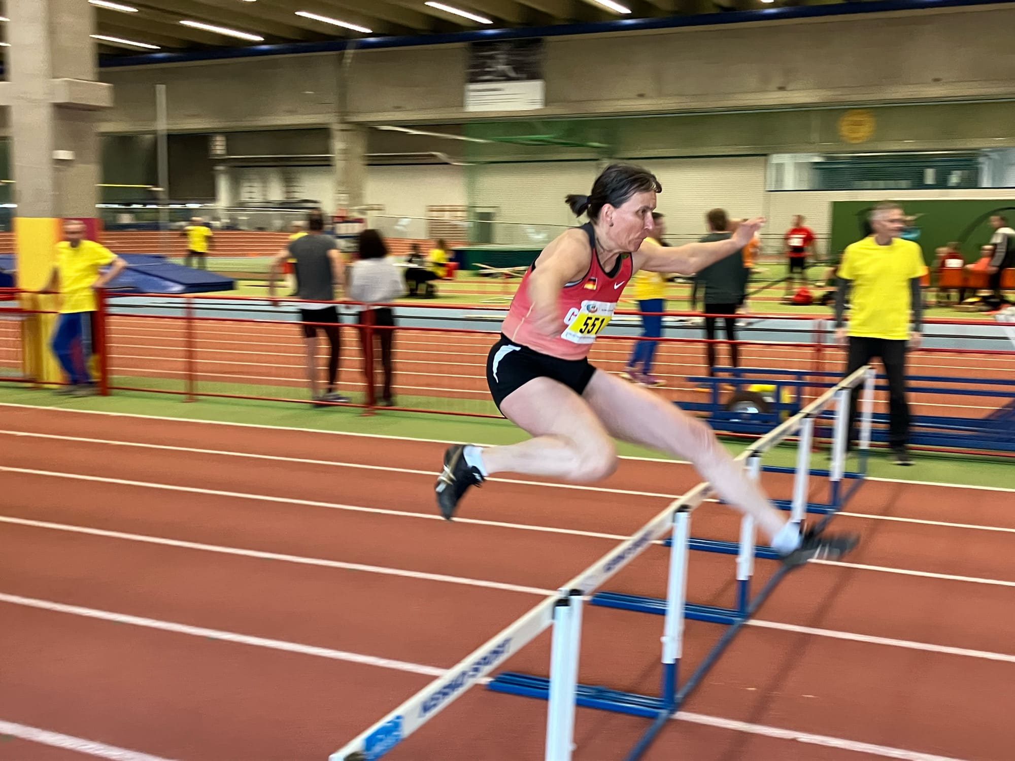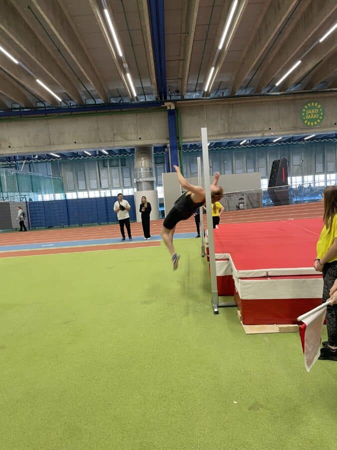 Dabei haben wir am ersten Tag 60m, „Weitsprung“, 800m, Kugelstoßen, 400m, Hochsprung und 3000m auf der 200m-Bahn absolviert.